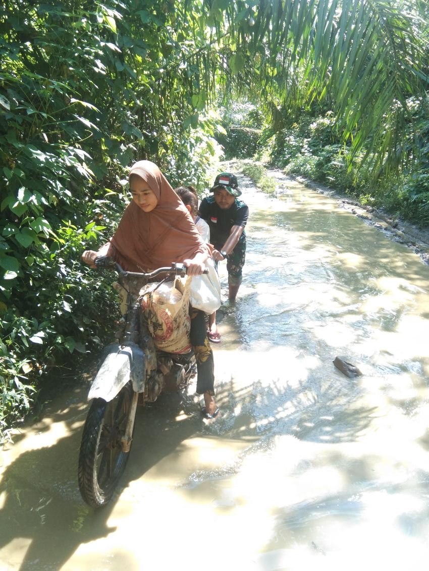 Sebuah motor milik Ibu Yulida Siregar tiba-tiba mogok di tengah jalan karena kehabisan bahan bakar. Namun, bantuan tak terduga datang dari Prada Timbul Manurung, anggota Satgas TMMD, yang dengan cepat turun tangan membantu mendorong motor tersebut.