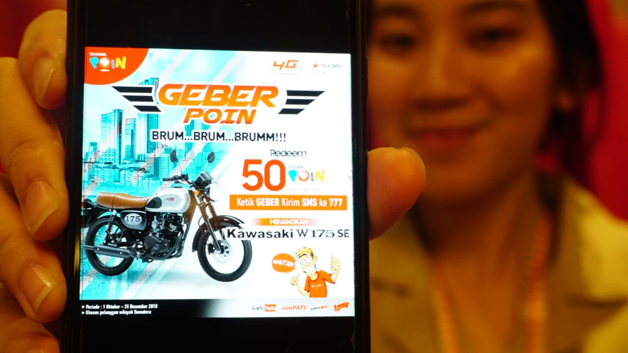 Sebagai bagian dari program loyalty kepada pelanggan, Telkomsel menggelar “Telkomsel Poin GEBER 2018â€, yang betlangsung dari 1 Oktober hingga 31 Desember 2018, bagi seluruh pelanggan kartuHalo, simPATI, Kartu As, dan LOOP. Dengan program ini, pelanggan berpeluang mendapatkan hadiah sepeda motor Kawasaki W175 SE.Â