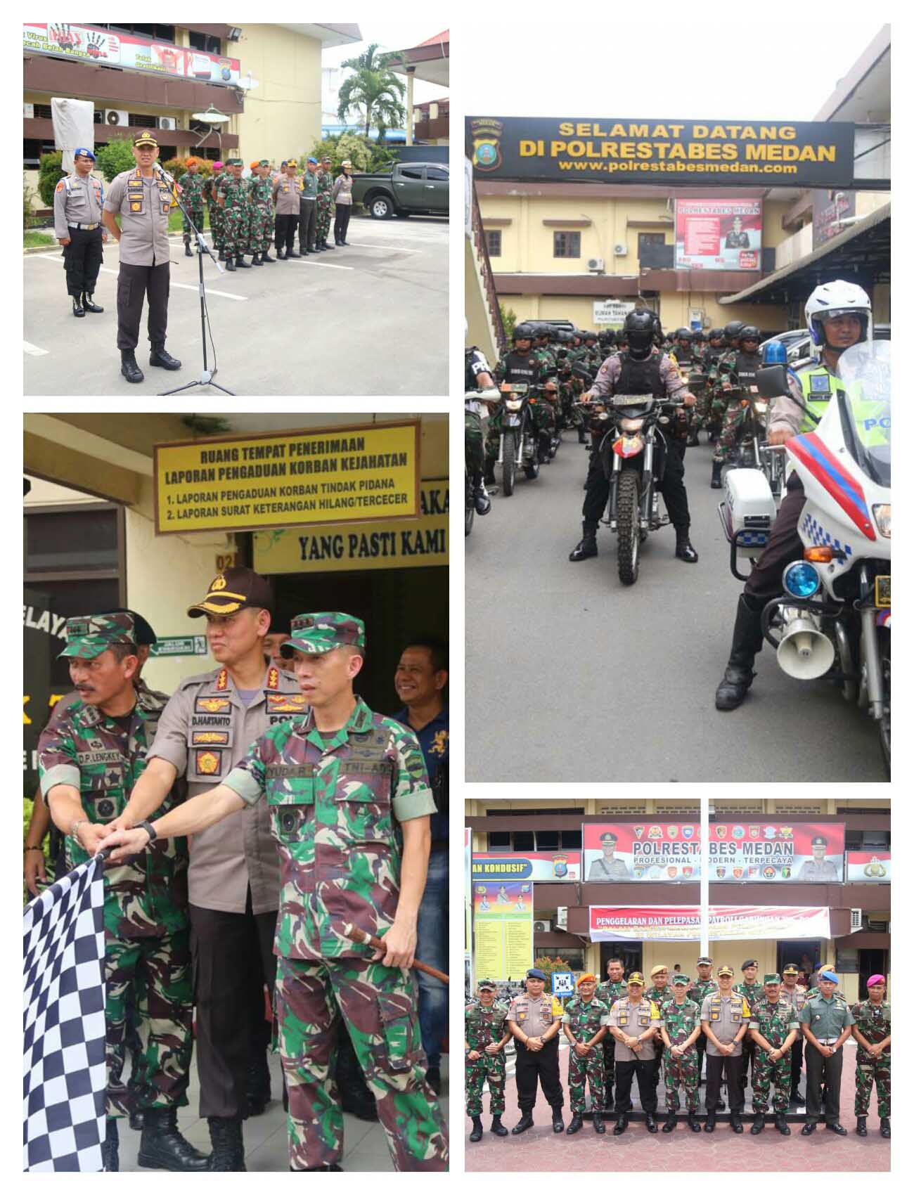 MEDAN | SUMUT24.co Kapolrestabes Medan Kombes Pol Dr HDadang Hartanto SH SIK MSi melaksanakan Rapat Koordinasi (Rakor) sekaligus pelepasan patroli gabungan TNI-Polri bersama bertempat di lapangan Apel Polrestabes Medan jalan H.M Said No 1 Medan, Selasa (2/4/2019). Kegiatan ini dihadiri, Kapolrestabes Medan Kombes Pol Dr H Dadang Hartanto SH SIK MSi, Danlanud Soewondo Medan Kol Pnb Dirk Poltje lengkey, Dandim 0201/BS Kol Inf Yuda Rismansyah, Kapolres Belawan AKBP Ikhwan Lubis SH MH, Waka Polrestabes Medan AKBP Rudi Rifani SIK, Wadansat Brimobda Sumut AKBP Fery R Ukali, Dandenpom I Letkol CPM Anggun Hendryantoro, Wadan Wing III Paskhas Letkol R H Aritonang, Kadis Ops Lanud Soewondo Letkol Nicolas Sinaga, Danyon Marinir Letkol Mar James Munthe, Danyon Armed Letkol Adietya,bDanyon Zipur Letkol Eko Supri, Danyon Kaveleri 6 Mayor Kav Jackie Yudha,bKetua FKUB Kota Medan  Drs H Ilyas Halim Mpd, PjU Polrestabes Medan,Tokoh Agama, Tokoh Masyarakat dan Personel TNI-Polri. Kegiatan Rapat koordinasi Sekaligus Pelepasan Patroli gabungan TNI-Polri dalam rangka menciptakan Situasi Aman dan Kondusif untuk mewujudkan Pemilu damai 2019. Kapolrestabes Medan Kombes Pol Dr Dadang Hartanto SH SIK MSi dalam samvutanya mengatakan  kegiatan Rapat Koordinasi Sekaligus Pelepasan Patroli gabungan TNI-Polri menciptakan Situasi aman dan Kondusif. “Ini merupakan implementasi dari pesta demokrasi di negara kita. Hajatan besar negara kita yang dilaksanakan setiap 5 tahun untuk memilih presiden dan Legislatif,” ucap Kombes Pol Dadang. Kita ketahui bahwa di dalam pesta demokrasi, keamanan merupakan faktor yang sangat penting dan utama agar pelaksanaan pesta demokrasi yaitu pemilu tahun 2019 dapat berjalan dengan lancar Aman damai kondusif sehingga terpilih nanti pimpinan nasional maupun wakil-wakil rakyat yang akan duduk di DPR ini orang-orang yang diberikan amanah oleh rakyat. Namun sambung Kapolrestabes Medan, dalam implementasinya dalam pelaksanaannya ada berbagai kerawanan dan kerawanan ini harus kita hadapi. “Ada beberapa kerawanan antara lain konflik antar kelompok walaupun masih menjadi potensi konflik harus kita antisipasi seperti berita-berita hoax, isu sara dan ujaran kebencian,” ujarnya. Kita lanjut orang nomor satu di Mapolrestabes Medan ini, sebagai aparat keamanan TNI dan Polri ber- tanggung jawab oleh negara melalui undang-undang sesuai dengan peran dan fungsinya masing-masing memiliki tugas dan tanggung jawab untuk menyelenggarakan keamanan. “Saya mengucapkan terima kasih kepada para pimpinan satuan yang telah menugaskan anggotanya untuk turut berkontribusi dan menyumbangkan pemikiran, tenaga dan dedikasinya sehingga tugas kita dalam melaksanakan pengamanan ini dapat berjalan dengan lancar.Sinergitas TNI Polri, soliditas merupakan bagian yang sangat penting di dalam negara ini. TNI-Polri merupakan pilar negara ini,” urainya. Lebih jauh diungkapkan Kombes PolcDadang, pelaksanaan tugas pengamanan pemilu 2019 ini, masyarakat di luar sana sangat mengharapkan kehadiran Tni Polri. “Kehadiran TNI-Polri di tengah masyarakat menjadi bukti bahwa negara hadir dan selalu merespon harapan harapan masyarakat akan kebutuhannya. Oleh karena itu, kami semua bersungguh-sungguh satu padukan langkah kerjasama, komunikasi, koordinasi diantara kita semua wajib dilaksanakan yaitu mulai dari tataran pimpinan yang telah dicontohkan oleh Bapak panglima TNI maupun Bapak Kapolri yang selalu bersama-sama ke mana pun beliau melaksanakan tugas,” pungkasnya. Dan hari ini, itu kita wujudkan dalam pelaksanaan tugas patroli gabungan dengan berusaha yang sungguh-sungguh ini dapat terwujud dan tentu diiringi dengan doa kita semua. “Laksanakan patroli gabungan ini dengan baik, tertib, profesional kemudian tunjukkan kepada masyarakat bahwa kita adalah alat negara yang dipercaya oleh masyarakat untuk menjaga keamanan dan ketertiban,” harapnya.(W02)