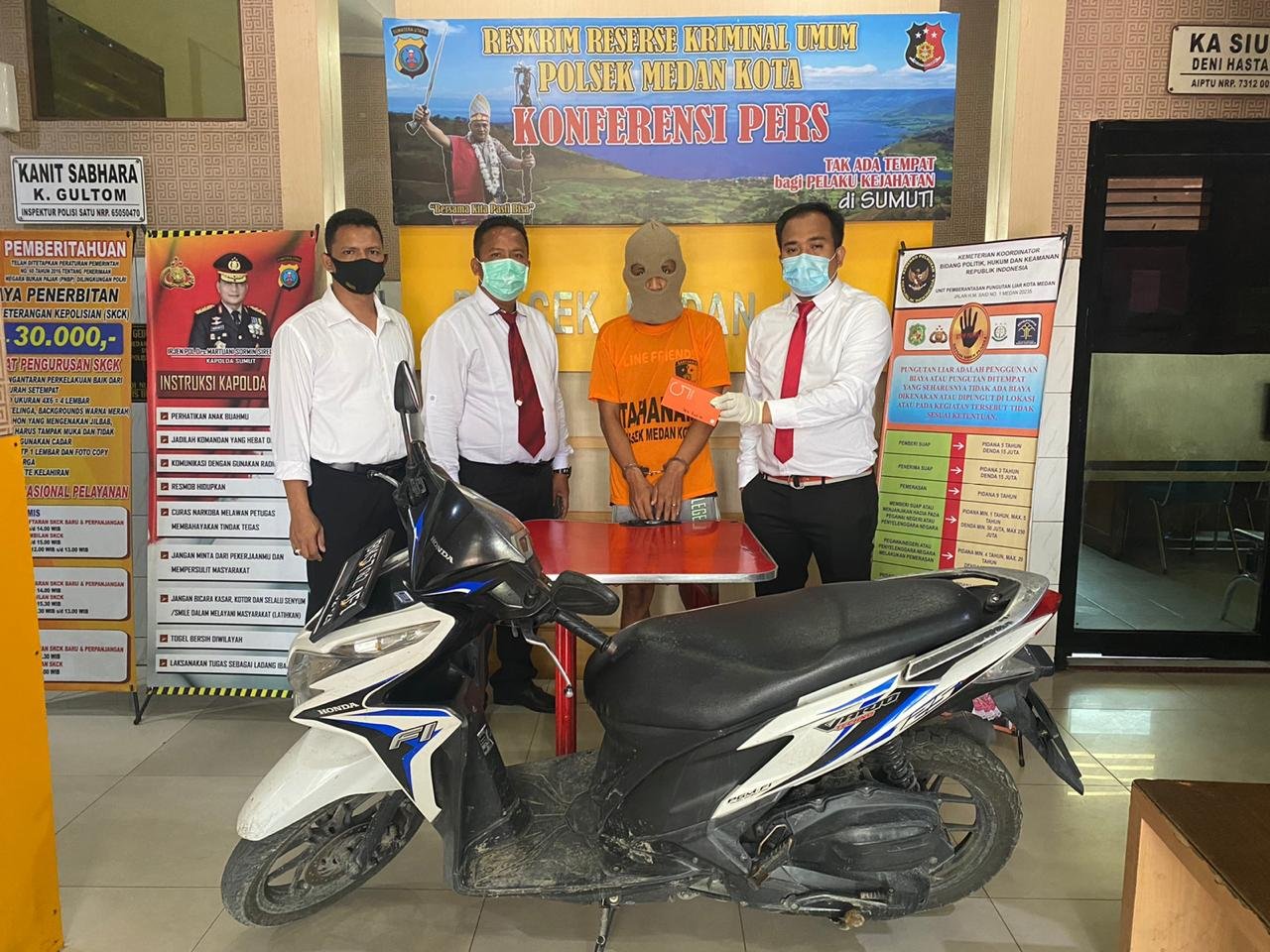 MEDAN I SUMUT24.co Satu dari dua orang pelaku tindak pidana pencurian dengan pemberatan diringkus Tim Tekab Polsek Medan Kota dikawasan Jalan Tapian Nauli, Kelurahan Teladan Barat, Kecamatan Medan Kota. (04/05/2020) lalu. Informasi dikepolisian mengatakan tersangka yang diamankan bernama, Pramu Dianda (32) tahun warga Jalan Tapian Nauli, Kelurahan Teladan Barat, Kecamatan Medan Kota. Penangkapan tersangka ini berdasarkan Laporan Polisi, LP /206/K/V/2020/SU/POLRESTABES MEDAN/sek MEDAN KOTA. Atas nama korban, Dea Ratini Sinaga (25) tahun warga Jalan SM Raja, Gang Sepakat Medan. Kapolsek Medan Kota Kompol Rikki Ramadhan melalui Kanit Reskrim Iptu Ainul Yaqin kepada wartawan menjelaskan penangkapan tersangka ini berdasarkan adanya rekaman CCTV, disini banyak petunjuk lain seperti plat nopol sepmor yang digunakan tersangka, atas petunjuk tersebut tersangka dapat kita tangkap didepan rumahnya dikawasan Jalan Tapian Nauli, Kelurahan Teladan Barat, Kecamatan Medan Kota lalu diboyong ke Komando. Ungkap Yaqin, Selasa (19/05/2020) Kronologis singkat pada hari Senin, tanggal 04  mei 2020 sekira pukul 19.30  pelaku datang ke tempat korban jual coffi  di jalan Turi  Medan dengan modos mau membeli coffi tersebut. Sewaktu korban membuat pesanan coffi tersebut tersangka langsung mengambil satu buah hp yg terletak diatas meja. Lalu kabur bersama rekan tersangka yang udah stanbay di atas sepeda motornya. Lanjut Yaqin, tersangka di tangkap  tanpa ada perlawanan, ketika diintrogasi tersangka mengakui semua  perbuatanya sementara kawan tersangka lainnya masih dalam pengejaran ( Simon). Hasil curian di jual ke tangan Rian yg beralamat di jln Tapian nauli no.42, seharga Rp.500.000 sepeda motor tersangka yg di gunakan sudah kita amankan. untuk periksaan lebih lanjut tersangka dijebloskan kedalam sel Polsek Medan kota. Ujar mantan Kanit Reskrim Polsek Patumbak ini.(W05)