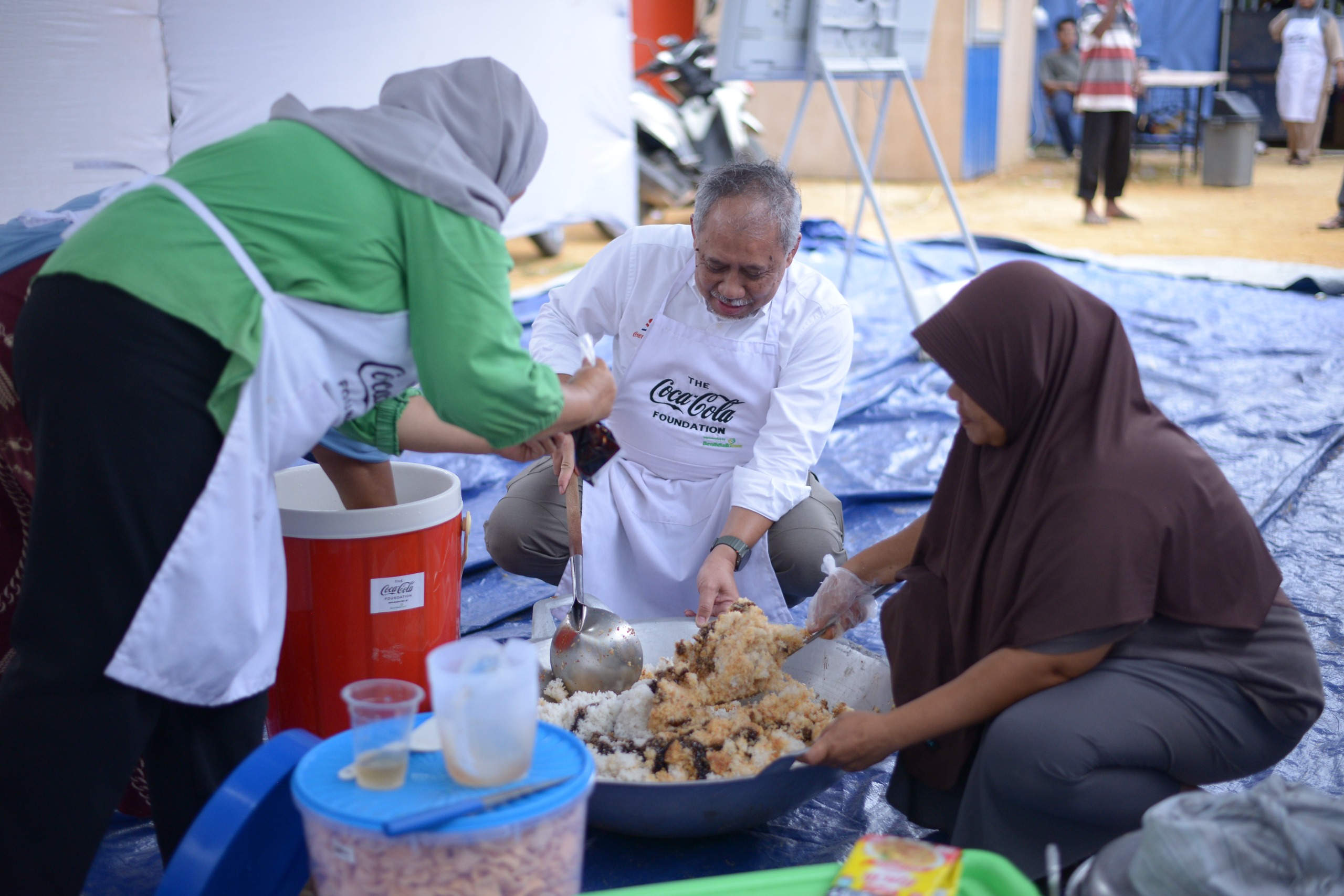 Melalui dukungan hibah dari The Coca-Cola Foundation, menyalurkan bantuan bagi masyarakat terdampak banjir di Aceh Tamiang, termasuk di wilayah yang terisolasi. Turut hadir dalam kegiatan ini, Triyono Prijosoesilo, Ketua Coca-Cola Foundation Indonesia (tengah), yang berpartisipasi dalam penyediaan makanan harian bagi masyarakat terdampak.